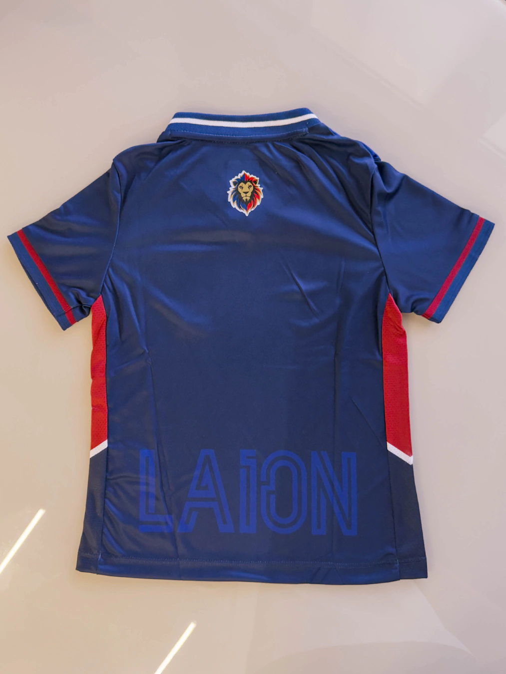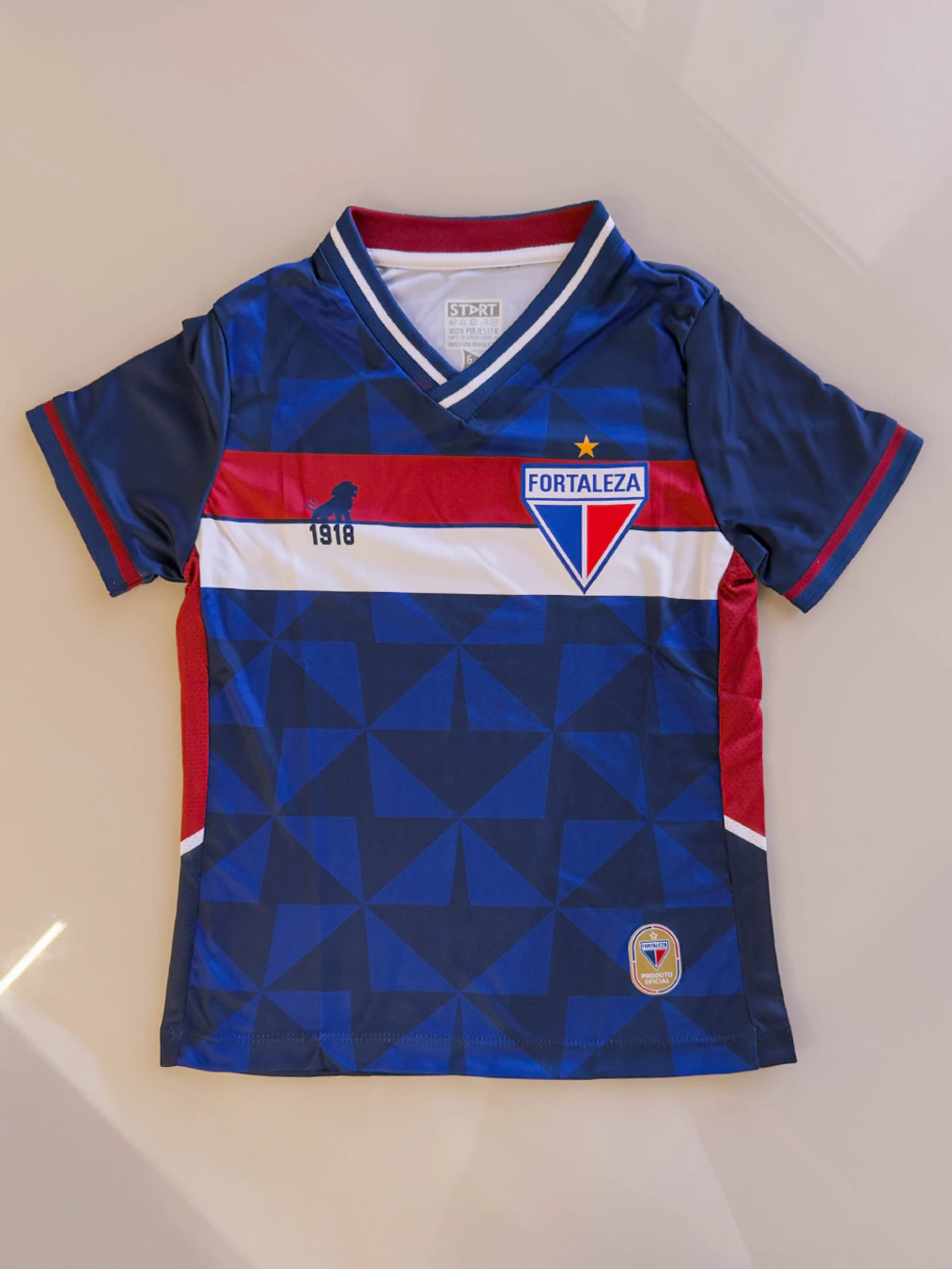 Camisa azul marinho, tecido poliester, gola V, faixas no peito vermelha e branca com escudo de tecido aplicado.