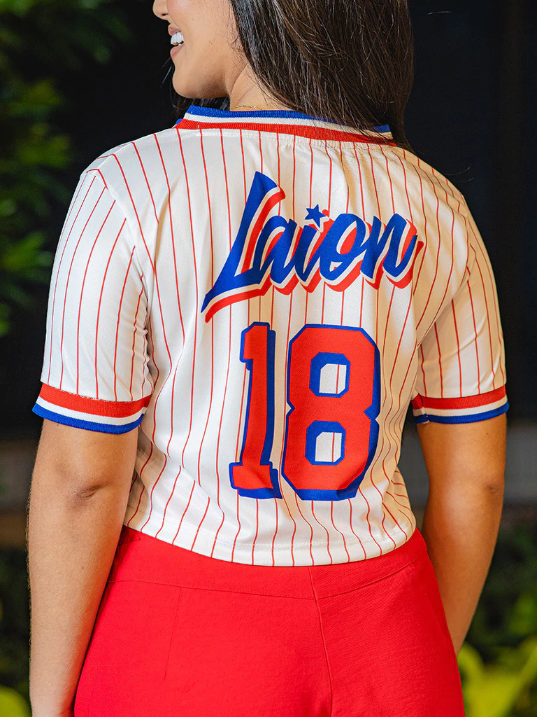 Cropped na cor branco, com gola VAB, listras vermelhas, número 18 na frente e costas.