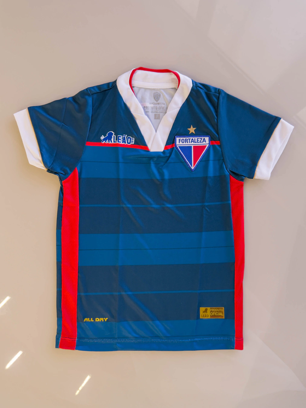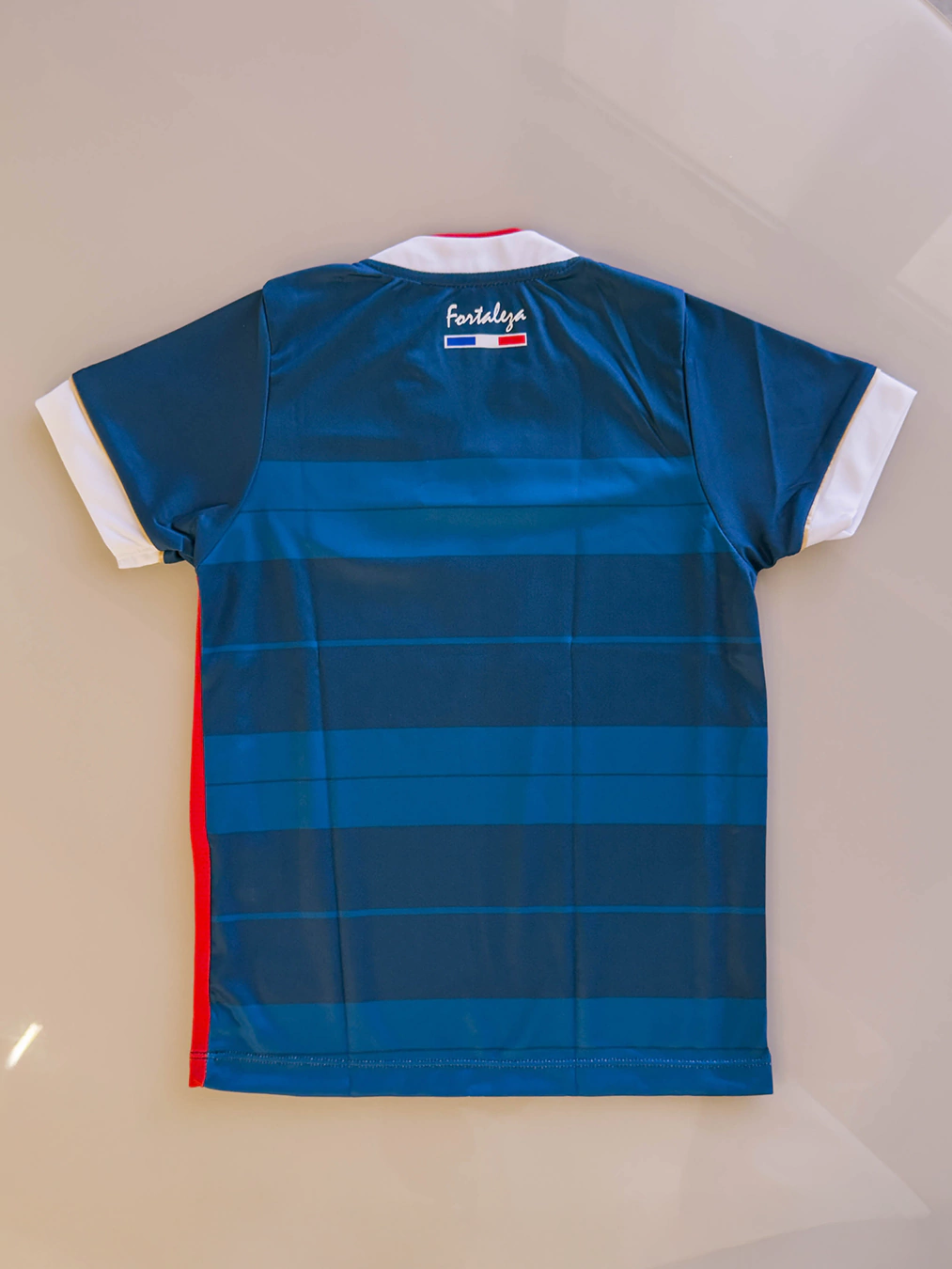 Camisa azul, tecido poliester, com detalhes laterais vermelhos e escudo bordado aplicado.